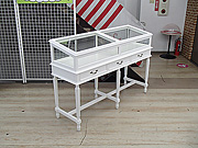 ショーケースは主に大型で重量があり店舗の撤退と同時に産業廃棄物となってしまうことが多いのですが、弊社ではなるべく高価にて買い取り、修理・清掃・部品交換などの処理を行うことによってリサイクル品として蘇らせます。幸いなことにショーケースの部品はガラスやアルミニウムなど長く使用されても品質は殆ど変わらないものが多く、傷は残りますが汚れを取ればまだまだ使用することができます。ものによっては商品化に手間はかかりますがショーケースを安い金額でご提供できるよう努めております。