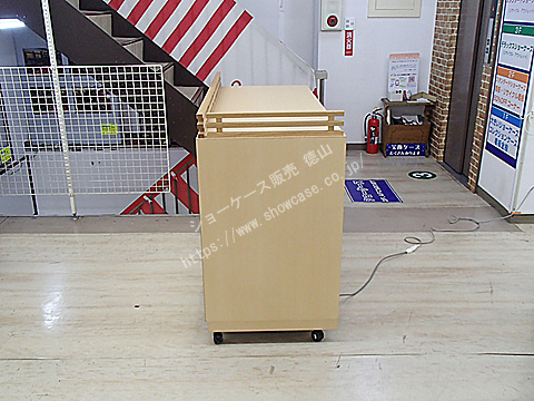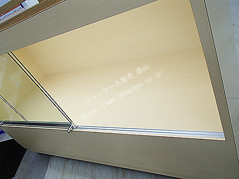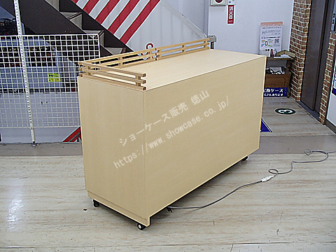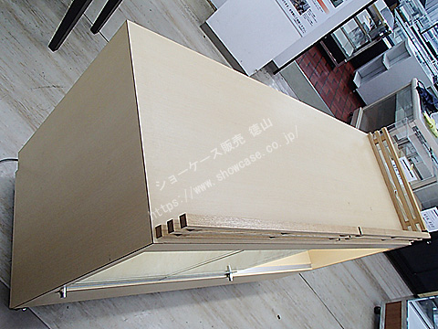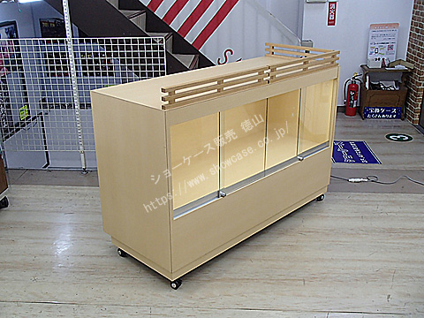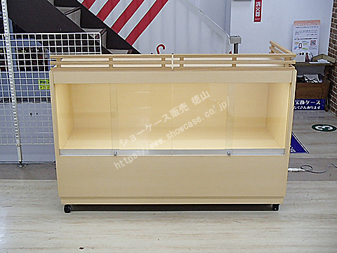 | オーダーメイドの木製ガラスケースのリサイクルです。 ケース上部には4辺中2辺に柵のような飾りがついています。 このケース2台に加え、逆のL字柵になっている2台があり、4台をひと繋ぎにするとW3000xD1200の大きな展示台になるためです。 ガラス引き戸にはプッシュロックがついており、内部にはスリム蛍光灯が1灯ついています。 |