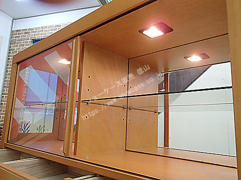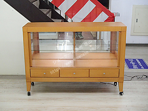 | 都内の仏壇店から買い取ってきた国産オーダーメイドの木製平ケースです。 腰部には引き出しの収納ストッカーが3つついていて便利です。 周囲が透明ガラスでないため中が暗くなりがちですが、天井にダウンライトがついているので問題ありません。 背面は鏡になっていて展示品の背中側も映し出してくれます。 |