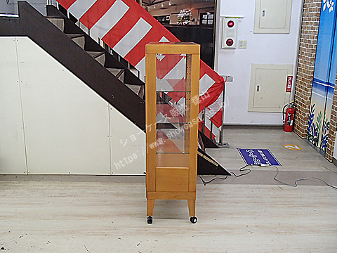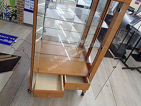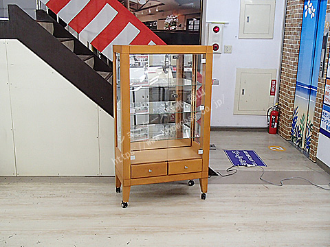 | 都内の仏壇店から買い取ってきた国産オーダーメイドの木製平ケースです。 腰部には引き出しの収納ストッカーが2つついていて便利です。 周囲が透明ガラスでないため中が暗くなりがちですが、天井にダウンライトがついているので問題ありません。 背面は鏡になっていて展示品の背中側も映し出してくれます。 |