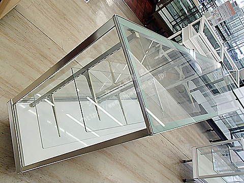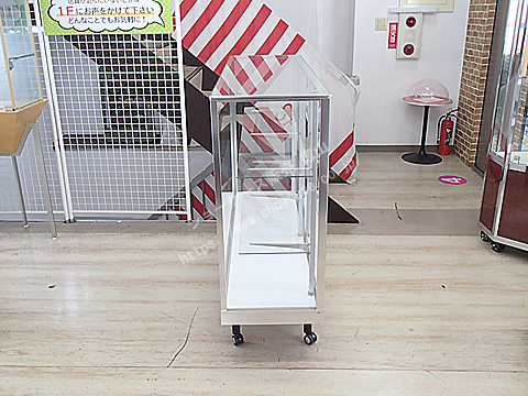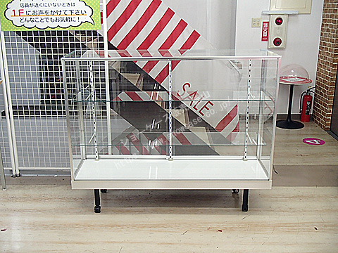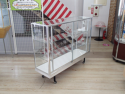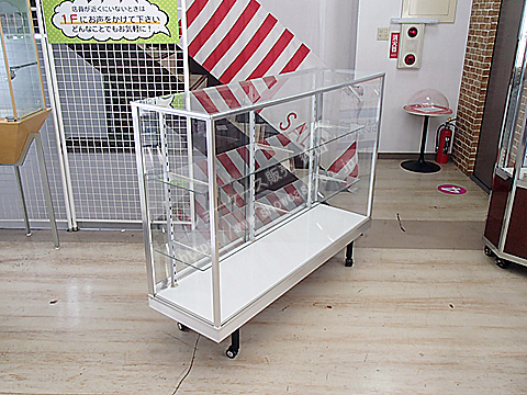 | 金券ショップで使用されていたアルミガラスショーケースのリサイクルです。 鍵やLEDの追加取付オプションは可能ですのでご相談ください。 対面販売向けにガラス引戸は店員側にあたる背面側についています。 棚受けが廃番のため棚ガラスの段数をふやすことが出来ません。 |