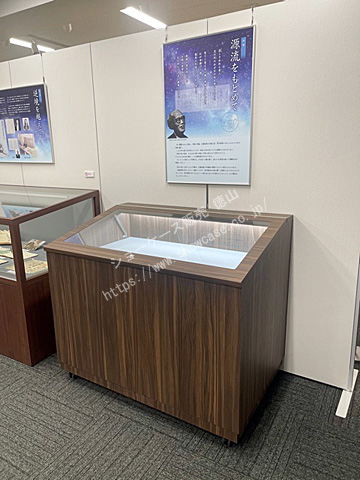 | 展示品を上から覗き込むのに適した形状のショーケースです。 木目が温かみのある雰囲気を作っています。 ショーケース内には照明が取りつけられています。 ガラス面から展示物の距離が短いので顔を近づけて鑑賞ができます。 展示ケースについてはこちら ショーケースの照明についてはこちら |